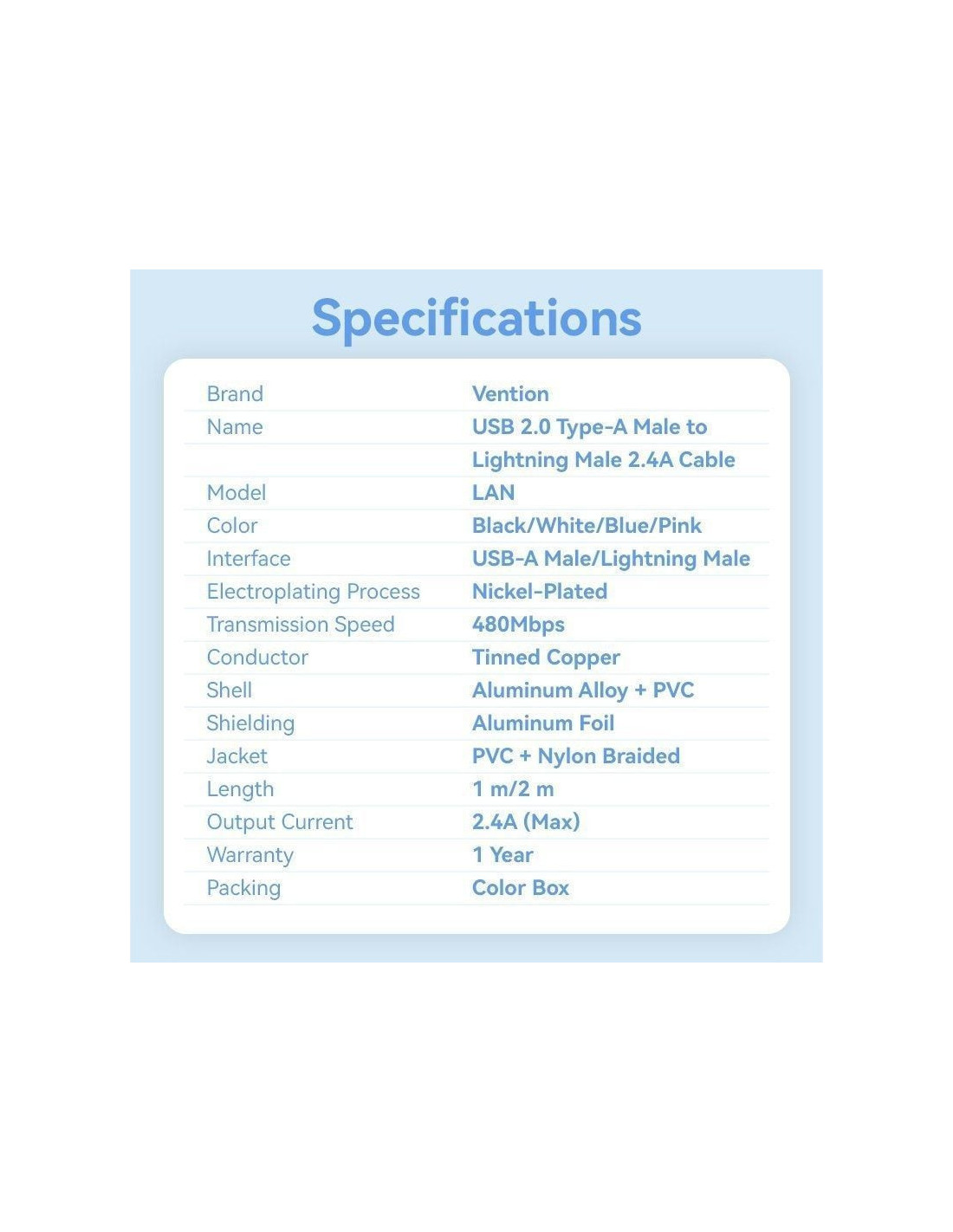 Cable usb lightning vention lanbf/ usb macho - lightning macho/ 480mbps/ 1m/ negro