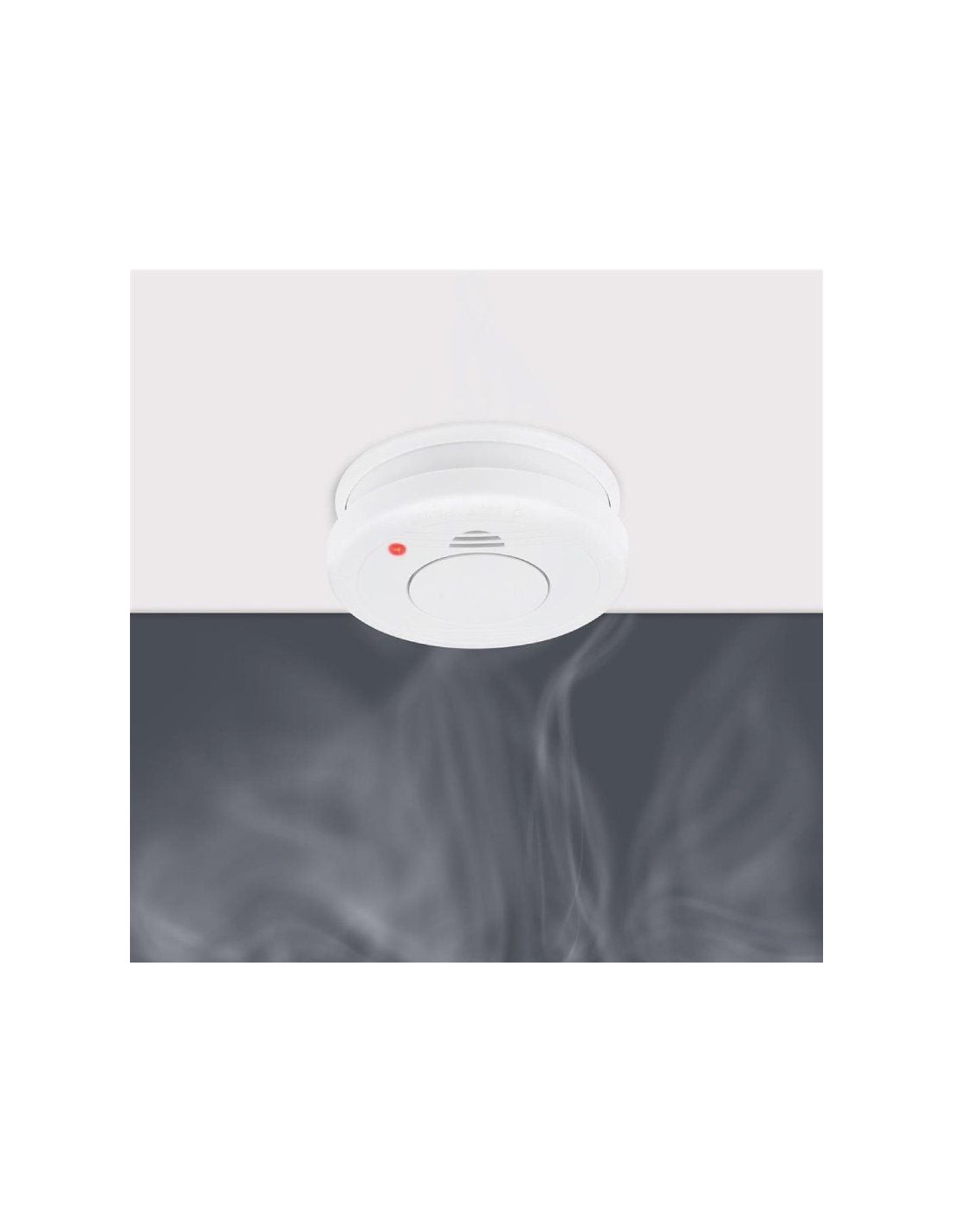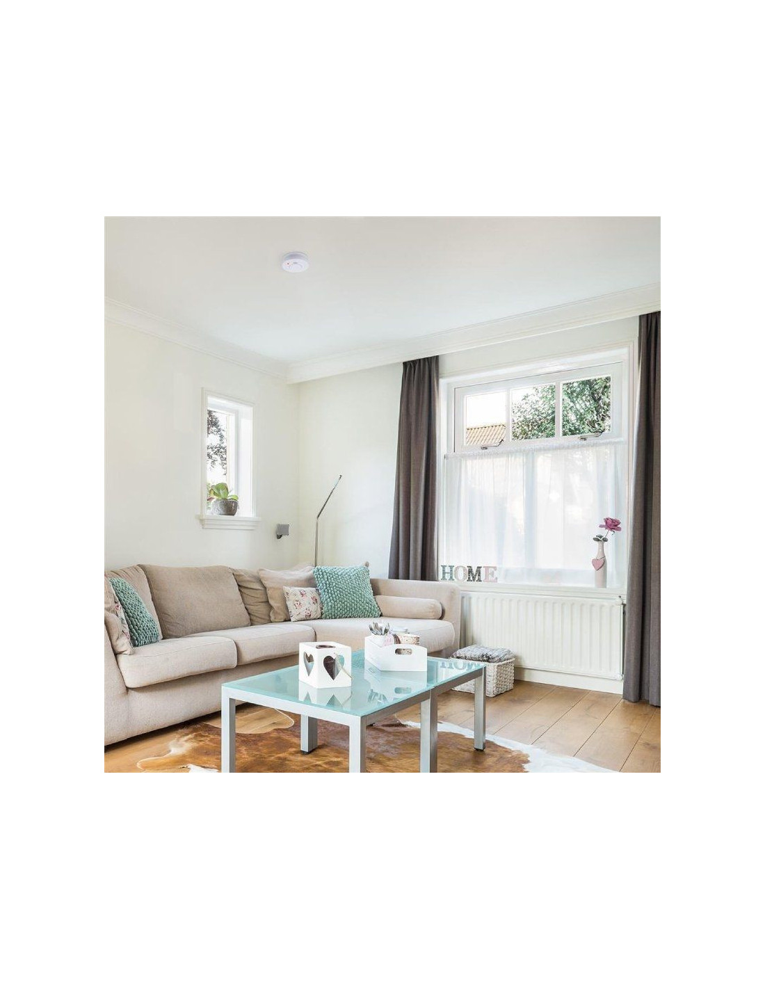 Este detector de humo incluye una batería de 1 año. Utiliza un sensor fotoeléctrico y tiene una alarma sonora de 85 db a 3m de distancia. Su función silenciosa le permite disminuir el nivel de sensibilidad de la alarma durante 10 minutos.