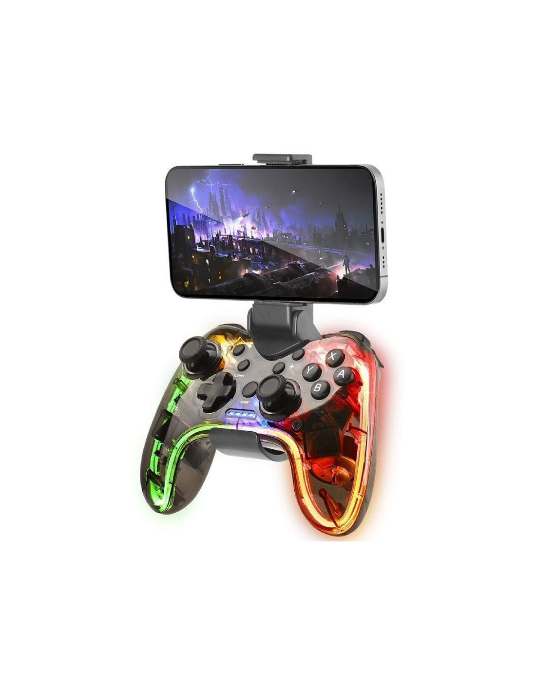 Gamepad inalámbrico con conexión dual Bluetooth 5.0 y USB. Sistema giroscópico avanzado y vibración háptica dual. Espectacular diseño translúcido negro con iluminación NEÓN RGB. App de control Android/IOS. Adaptador para smartphone y compatibilidad multiplataforma