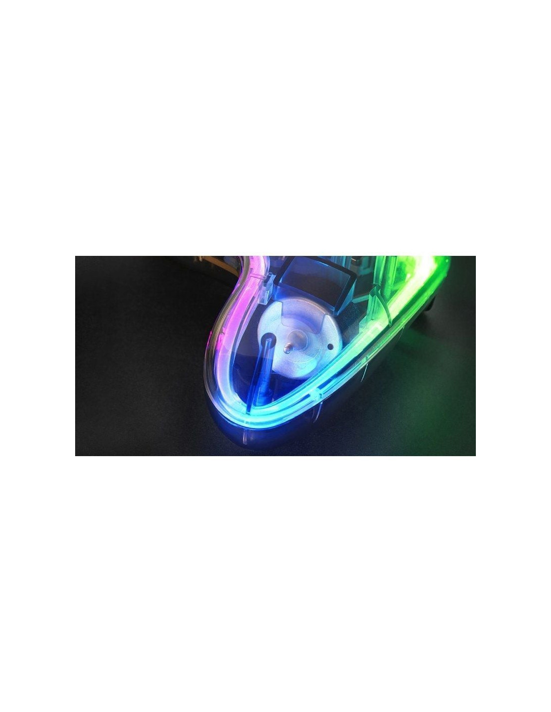 Admira la belleza electrónica y mecánica del MGP-BT a través de su acabado negro translúcido y deslumbra con su espectacular sistema de iluminación multimodo RGB por fibra óptica.
