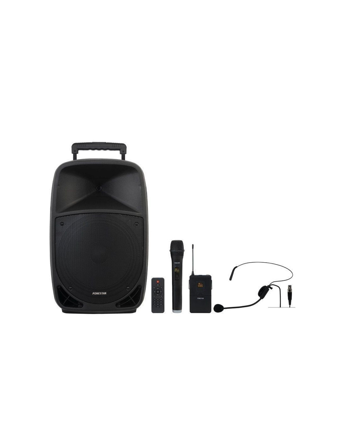 Altavoz portátil con reproductor Bluetooth/USB/microSD/FM/LINE y 2 micrófonos inalámbricos UHF (1 de mano y 1 de cabeza).