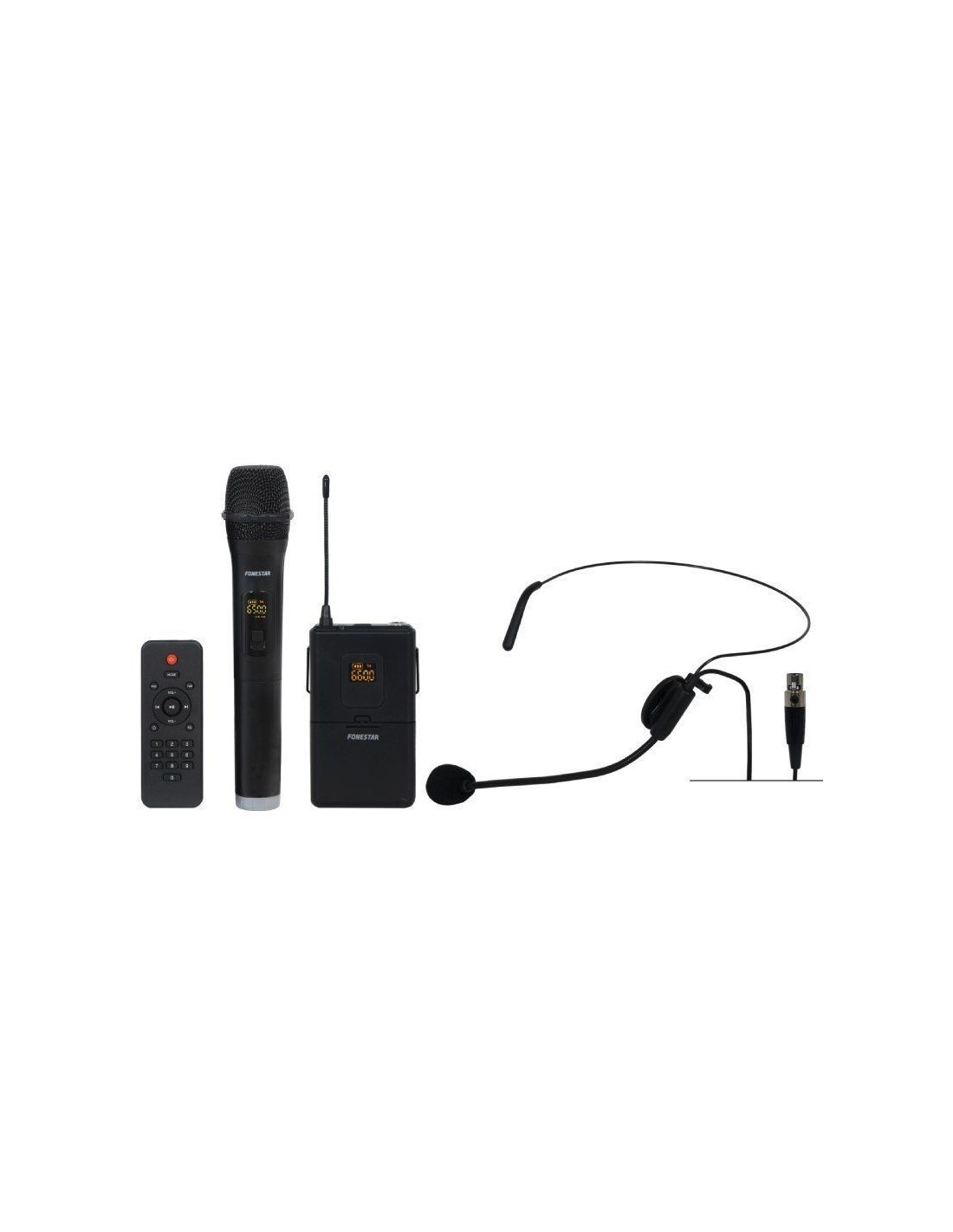 - 2 micrófonos inalámbricos UHF, 1 de mano y 1 de cabeza (650 MHz y 660 MHz ) respectivamente.