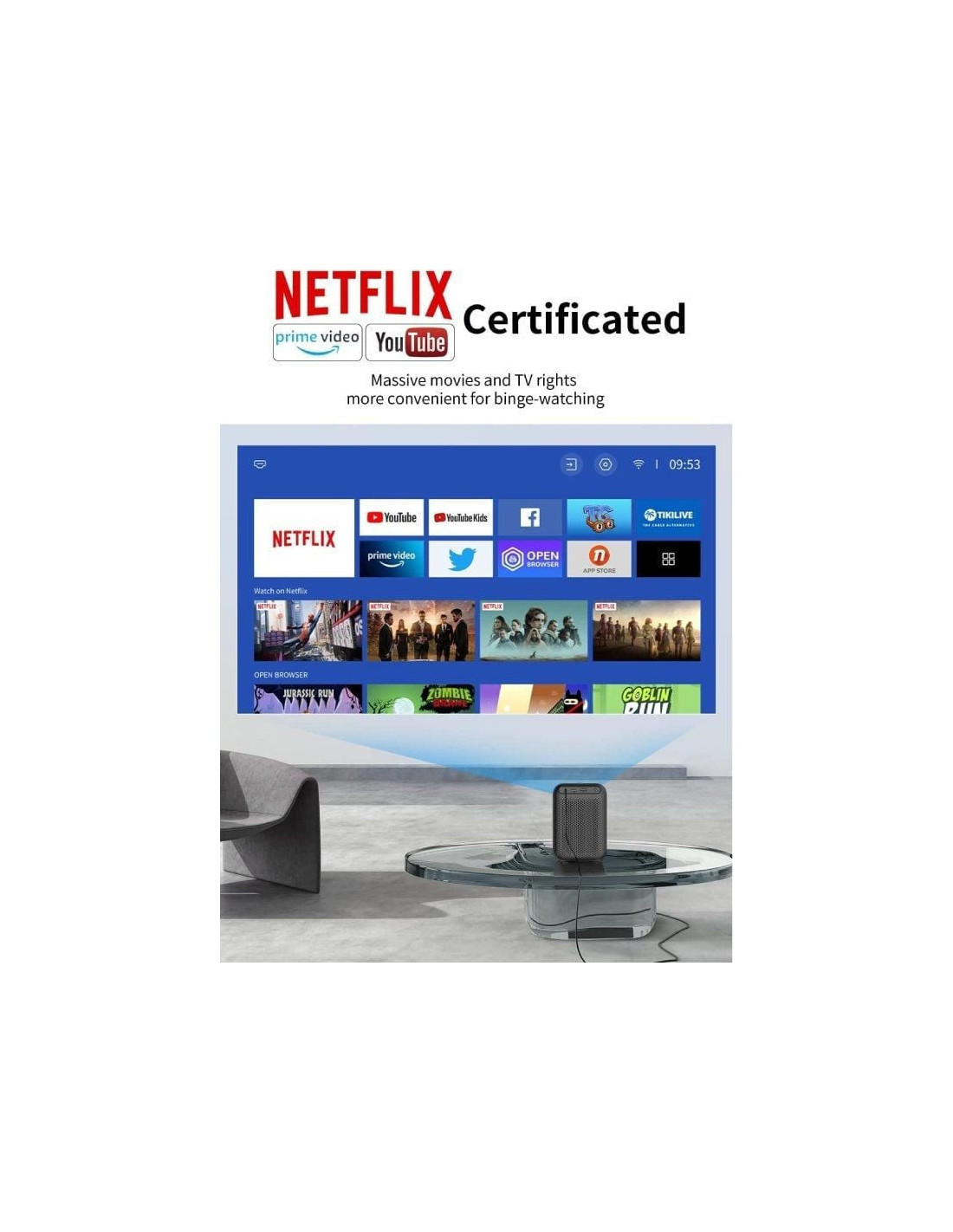 - Certificado por Netflix y Dolby: Wanbo TT es el primer proyector certificado oficialmente por Netflix de la India. El sistema integrado de TT tiene la certificación Widevine L1, lo que garantiza una reproducción perfecta de aplicaciones OTT como Prime Video, Sony liv, etc. en resolución Full HD. Con compatibilidad con Dolby Atmos y potentes parlantes estéreo duales de 5 W*2, puedes disfrutar de películas y programas de TV en línea de alta calidad con sonido envolvente estéreo de alta fidelidad, creando una experiencia visual inmersiva.