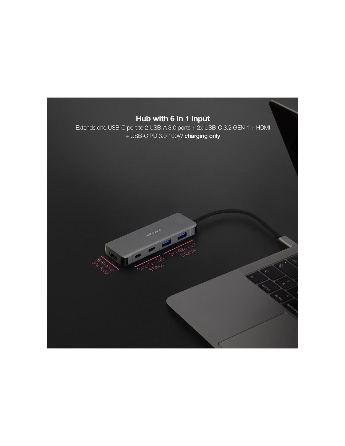 - Hub USB-C 3.2 GEN1 macho en un extremo y 2 puertos USB 3.0 tipo A hembra, 3 puertos USB 3.0 tipo C hembra, 1 puerto HDMI hembra en el otro