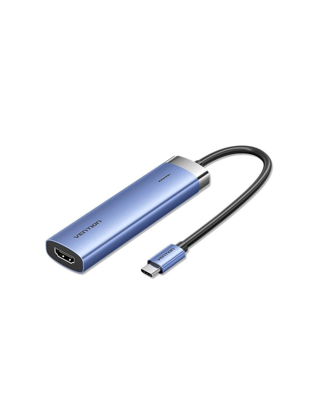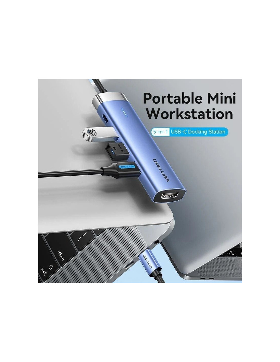 La estación de acoplamiento USB-C 5 en 1 Vention es un dispositivo portátil y sofisticado, diseñado elegantemente con un acabado azul contemporáneo. Esta notable estación de acoplamiento tiene como objetivo principal ampliar significativamente sus opciones de conectividad y, al mismo tiempo, optimizar y organizar su espacio de trabajo. Es una opción ideal para los usuarios que se centran en maximizar su productividad y eficiencia. El Vention T6E cuenta con una variedad de puertos esenciales, todos ellos elegantemente contenidos en un diseño compacto y fácil de usar, lo que lo convierte en un complemento perfecto para cualquier estación de trabajo moderna.